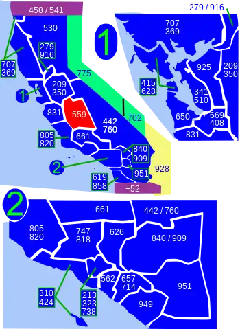 California area codes: 209, 213/323, 279/916, 310/424, 341/510, 408/669, 415/628, 442/760, 530, 559, 562, 619/858, 626, 650, 657/714, 661, 707, 747/818, 805/820, 831, 840/909, 925, 949, 951