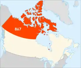 Area code 867 is the area code in the North American Numbering Plan (NANP) for the three Canadian territories, all of which are in Northern Canada. The area code was created on October 21, 1997, by combining regions that were previously served with area code 403 and area code 819 in one numbering plan area (NPA). As the least populated NPA in mainland North America, serving about 130,000 people, it is geographically the largest, at 3,921,739 km2 (1,514,192 sq mi), with Alaska (907) a distant second.
