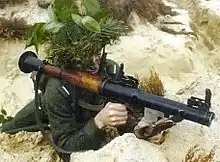 The Soviet Union developed the first active protection system between 1977 and 1982, named Drozd (Russian: Дрозд).[2][3] This system was designed as an alternative to passive or reactive armour, to defend against enemy anti-tank weapons.[4] The system's development was stimulated in large part by the introduction of new high-explosive anti-tank warheads. Drozd was designed to destroy these warheads before they hit the armour of a vehicle being attacked.[5] It was composed of three main parts: two launcher arrays placed on either side of the gun turret and an auxiliary power unit located to the rear of the turret.[6] The arrays were controlled by two millimeter-wave radar antennae. The system used a 19 kilograms (42 lb), 107 millimeters (4.2 in) cone-shaped fragmentation warhead. Drozd could protect a tank between the elevations of −6 and 20 degrees along the vertical plane, and between 40 and 60 degrees along the horizontal plane.[2][7] Although reported to offer an 80% increase in survival rate during its testing in Afghanistan, the radar was unable to adequately detect threats and the firing of its rockets caused unacceptably high levels of collateral damage.[2] About 250 Drozd systems were manufactured, all of which were installed on T-55s belonging to the Soviet Union's naval infantry.[6]