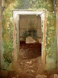 The chambers are approached by entrance passages, or dromos, which start at ground level and descend to the entrance of the tomb. The tombs are not identical, with some having ramps while others have stairs. The walls of the dromos have been cut in such a way that they are closer to each other at the top than they are at the bottom, probably to help bear the weight of the earth above. The entrances were originally covered by a large stone, which is usually still next to the entrance. Several of the larger tombs have a pillar in the center of the chamber. One tomb's walls are lined with stone benches cut directly from the rock.