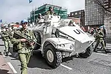 Six M113 armoured personnel carriers were loaned to Irish troops in the Congo operating as part of the UN force ONUC. The M113s were United States Army vehicles donated to the UN for the Congo peacekeeping force mission.[28] Following the withdrawal of Indian Army soldiers due to the Sino-Indian War, Irish from the Armoured Car Group took over responsibility for their position in Jadotville assuming control of six M113s and several Swedish APCs.[29] The M113 APC was a significant improvement over the Ford armoured cars and Swedish APCs used by the Irish forces up to then; easy to handle, tracked, amphibious and armed with a pintle-mount M2 Browning .50 machine gun. The vehicles were withdrawn early from the Armoured Car Group in the Congo and returned to US Army inventory.[29]