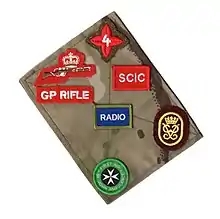 The primary weapon of the cadet forces is the L98A2 Cadet GP Rifle[29] this is a cadet specific version of the British Armed Forces' L85A2 SA80 which has been adapted to fire only on repetition (semi-automatic) and therefore does not have a change lever, the weapon system is chambered in the NATO 5.56x45mm cartridge. In order to become proficient in this weapon system and pass the one-star Skill at Arms (SAA) test, cadets must show they can handle the weapon safely, perform stoppage drills, and field strip the weapon for daily cleaning, in addition to passing one-star Skill at Arms the cadet also receives a Weapon Handling Test (WHT) pass which must be re-qualified every 6 months.[30] Once a cadet has an in date WHT, cadets can fire the weapon using blank rounds in field exercises using the Safe Blank Firing System (SBFS) and with live rounds on a range possibly gaining marksman qualification badges based on their accuracy. There is also a non-firing training version of the GP Rifle, the L103A2 DP (Drill Purpose), this is generally used for teaching cadets the basics of the weapon they are handling and for rifle drill. The L98A2 Cadet GP Rifle is also capable of being fitted with the British Army L41A1 sub-calibre adaptor which enables the weapon to fire .22 rimfire ammunition.
