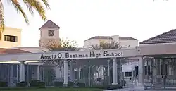 Arnold O. Beckman High School is a public school in Irvine, California, United States, serving 3,013 students from grades 9 through 12. The original $94 million facility was opened on August 30, 2004. The World Languages Building - a new, $17 million, two-story, 30,000-square-foot facility - was unveiled on September 1, 2015. The school is commonly known as Beckman and is named after Arnold Orville Beckman: a scientist, chemist, and philanthropist famed for inventing the pH scale during his tenure at Caltech and funding Silicon Valley's first semiconductor company (Shockley Semiconductor Laboratory, a division of Beckman Instruments, Inc.).