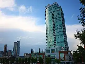 The Arriva Tower is a 128 m (418 ft) 34-storey[1] high-rise condominium in Calgary, Alberta, Canada. Located in Victoria Park, a historic neighbourhood in Calgary's Beltline neighbourhood, north of the Stampede Grounds and Scotiabank Saddledome. The glass and steel skyscraper features brick and sandstone finish at the base, to reflect the architectonic style of the surrounding historic buildings of the Warehouse District.