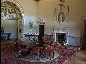 - The North Dining Room: Is a cube of 27 feet (8.2 m) a side, with a large apse in the middle of the south wall, this is richly coffered, and flanked by pilasters with richly carved rinceaux and mirrored panelling on their side facing the apse. Within the apse just behind the pilasters are two doors leading to a staircase that links to the service areas and kitchen. The two fireplaces are carved from Sicilian Jasper & white marble, with reliefs from Aesop's Fables, the eastern fireplace with The Bear and the Bee-Hive and the western The Sow and the Wolf, were carved by Thomas Carter, above are oval niches surrounded by plaster swags held in the talons of gilt plaster eagles. The ceiling has a small cove above a cornice, the edge of the ceiling proper being edged by a plaster beam that enclose a circular plaster beam both decorated with rinceaux, the centre of the ceiling is a shallow dome. The four doors that flank the fireplaces have pediments. The Venetian window is framed by Corinthian pilasters and columns. A large classical style porphyry table from Italy is in the centre of the apse, the curve of which follows that of the apse, with a red granite wine-cooler, two marble top tables flank the apse above which are brackets to support a bust. There is an elaborate silver candelabra over three feet in height in the centre of the circular dining table, the dining chairs are mahogany originally the sets were of red leather and the richly patterned and coloured Axminster carpet mirrors the form of the ceiling dome and plaster beams. The room is white with some gilding. An early 18th-century bracket clock sits in the centre of the porphyry table.