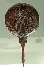 Etruscan fabrics approach their Greek originals so closely that it is not possible to separate them in technique or design, and the Etruscan style is no more than provincial Greek. Bronze was quite plentiful in Italy, the earliest Roman coinage was of heavy bronze, and there is literary evidence that Etruscan bronzes were exported. The process of line engraving seems to have been a Latin speciality; it was applied in pictorial subjects on the backs of mirrors and on the sides large cylindrical boxes, both of which are particularly connected with Praeneste. The finest of all such boxes, the Firconi cista in the Villa Giulia at Rome, bears the signature of a Roman artist. These belong to the 4th and 3rd centuries BC. Greek mirrors of the same period are seldom engraved; the disk is usually contained in a flat box which has a repoussé design on its lid.[1]