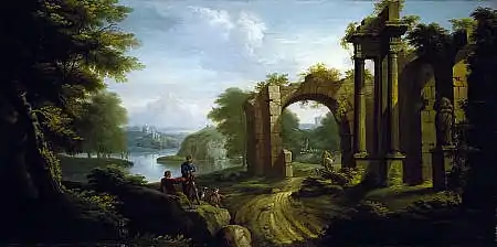 The growing importance of royal art can be seen in the post of Painter and Limner, created in 1702 for George Ogilvie. The duties included drawing pictures of the Monarch's person, his successors and members of the royal family, for the decoration of royal houses and palaces. However, from 1723 to 1823 the office was a sinecure held by members of the Abercrombie family, not necessarily connected with artistic ability.[32] Many painters of the early part of the eighteenth century remained largely artisans, like the members of the Norie family, James (1684–1757) and his sons, Robert and the younger James, who painted the houses of the peerage with Scottish landscapes that were capriccios or pastiches of Italian and Dutch landscapes.[33] They tutored artists and have been credited with the inception of the tradition of Scottish landscape painting that would come to fruition from the late eighteenth century.[34] Italy became an important point of reference for Scottish artists, with many taking the Grand Tour there to paint, sample the art and learn from Italian masters.[35]