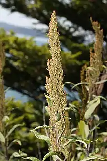 Artemisia suksdorfii grows in coastal drainages and other habitat near the ocean. This is a rhizomatous perennial herb producing many erect stems one half to two meters in height. The unbranched stems are brownish and have woody bases. The leaves are narrow and lobed, green and hairless on top and white and woolly underneath. The inflorescence is generally spike-like, up to 30 centimeters long and a few wide. It contains many clusters of small flower heads with shiny yellow-green phyllaries and yellow disc and pistillate florets. The fruit is a tiny achene less than a millimeter long.[3]