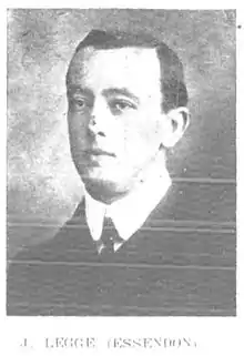 Playing at forward-pocket in Essendon's 1908 VFL Grand Final team,[6] Legge kicked the second of Essendon's three goals in its 3.8 (26) to 5.5 (35) loss to Carlton. His last game for Essendon was in the side that lost 8.11 (59) to 9.14 (68) to University on 22 May 1909.