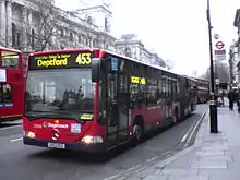 In June 2002, new Mercedes-Benz Citaro O530Gs were introduced on Red Arrow services 507 and 521.[3][4] While articulated bus operation had been standard in several other countries for over 20 years, their use in the United Kingdom had been limited, with their introduction in London gaining a lot of press attention.[5][6] They were later introduced on routes 12, 18, 25, 29, 38, 73, 149, 207, 436 and 453, which were among the busiest routes of the TfL bus network.[7]