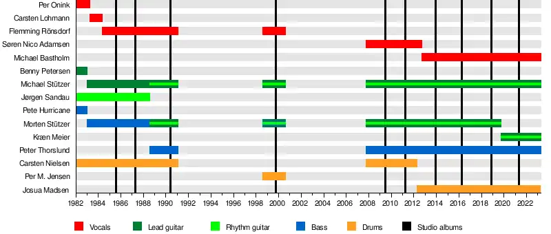 | Past members | Per Onink Carsten Lohmann John Mathias Mickey Find Jørgen Sandau Samir Belmaati Anders Gyldenøhr Per Moller Jensen Henrik Quaade Benny Dallschmidt Flemming Rönsdorf Michael "Romchael" Nielsen Mikael Ehlert Carsten Nielsen Søren Adamsen Morten Stützer Josua Madsen |