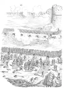 The first Western image of a battle with cannon goes back to the Siege of Orléans in 1429, in which both the English and the French side are depicted with firearms. French cannon killed the English commander Thomas Montagu in 1428.[3] Joan of Arc used cannon effectively during the Loire campaign in 1429.[3]