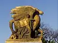 The A. Bruni Foundry in Rome and the Fonderia Lagana in Naples cast the sculptures[30] using the lost-wax casting process.[64] The foundries intended to use fire-gilding to finish the statues. Fire-gilding is a process in which gold leaf and mercury are applied to the bronze. Fire is applied to the area, which causes the gold to adhere to the bronze and the mercury to evaporate.[30] But several problems were encountered during both the casting and gilding phases. The foundries wanted to use joints that while less expensive to cast would not wear well, and the sculptors were forced to intervene to achieve the required quality. Samples of fire-gilded bronze were shipped to the United States, where it was discovered the color was too bright. This required both sculptors to intervene again to achieve the correct color. Minzolli then visited the foundries to check on the castings. He discovered that the Bruni foundry did excellent casting, but its gilding was poor. The casting at the Fonderia Lagana foundry was also of high quality, but not quite as good as that in Rome. Its gilding was better than the Roman foundry's, however. Fraser looked into moving part of the casting work to the Artistic Foundry Battaglia[65] in Milan and the Ferdinando Marinelli Artistic Foundry in Florence.[66] The Milan foundry's work was at least as good as that done at the Neapolitan foundry. The Florentine foundry, however, did good casting work but exceptionally poor gilding. In the end, the gilding work on Valor was done in Milan and Sacrifice in Florence. The Rome foundry did both casting and gilding on Aspiration and Literature, while Naples did casting and gilding for Music and Harvest.[64][67] Spending $58,000 ($653,913 in 2024 dollars) on gold, more than 100 pounds (45 kg) of 24-karat gold (currently worth $2,625,000) was used in the gilding process.[55][68][69]