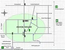 Ashok Nagar is located west of Mambalam (T. Nagar), Chennai, Tamil Nadu, India. It is surrounded by KK Nagar on the West, Vadapalani on the North, Kodambakkam on the North East and Saidapet on the South.