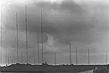 Its antenna was three guyed masts, each 110 m (360 ft) tall, directing the signal broadly eastwards. The 1940s Art Deco style transmitter building was in an underground shelter which had been excavated by a Canadian army construction unit. Power for the transmitter was supplied from two flat eight diesels with blown superchargers made by Crossley-Premier heavy oil engine.[2] A single flywheel type alternator was used to supply the power, rated at 3190 HP, as the local electricity supply did not have the necessary capacity.