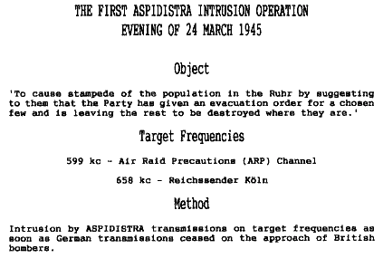 The first such intrusion was carried out on 25 March 1945. On 30 March 1945 Aspidistra intruded on the Berlin and Hamburg stations, warning that the Allies were trying to spread confusion by sending false telephone messages from occupied towns to unoccupied towns. On 8 April 1945 "Aspidistra" intruded on the Hamburg and Leipzig stations to warn of forged banknotes in circulation. On 9 April 1945 there were announcements encouraging people to evacuate to seven bomb-free zones in central and southern Germany. All these announcements were false.