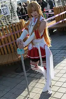 Sword Art Online girls (including Asuna) feature in a merchandise lottery by Bandai, with Anime News Network humorously noting that "the girls of Sword Art Online have brought in a pretty penny for the franchise's creators, whether the characters are lounging under parasols or starring in their own manga spin-off."[30] Replicas of Asuna's "Wind Fleuret" and Kirito's "Elucidator" rapiers have been built.[31] There are also Kirito, Asuna, and Sinon Sword Art Online-branded perfumes for sale; "Asuna" is described as " a sweet, irresistibly refreshing scent of galbanum and jasmine."[32] Sword Art Online glasses based on the characters had a "Fairy Dance Asuna" model "inspired by [her] time in Yggdrasil, the World Tree", and "these glasses have pale pink frames with a red ribbon and flowing hair depicted on each arm."[33] There are also earphone jack figures of Asuna (in both regular and Titania versions), Leafa, and Suguha.[34] Asuna has featured in several Sword Art Online-related video games. This includes Dengeki Bunko: Fighting Climax, in which several characters appearing under the Dengeki Bunko imprint are featured.[35] Asuna, Kirito and Leafa appeared in a campaign by the "Manga Anime Guardians" project in combating anime and manga piracy, with the project being supported by 15 anime production studios and manga publishers.[36] There are also 3D light-up LED models of Kirito, Asuna, Sinon, Leafa, and Yuuki.[37]