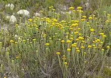 This shrub, which grows to be 60 cm (2.0 ft) tall, is densely leafed. The leaves range from round to oblong in shape and are alternately arranged. The margins have 3-5 convex teeth, although they can also rarely have straight edges.[2] The flowers are yellow with 10-40 florets that grow from a ringed base. The discoid flower heads are mostly borne in terminal corymbs with a ringed base of dense stalked glands.[2] They are present between October and January.[3]