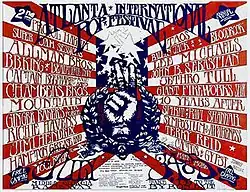 The second Atlanta International Pop Festival was a rock festival held in a soybean field adjacent to the Middle Georgia Raceway in Byron, Georgia, from July 3–5, 1970, although it did not finish until after dawn on the 6th.[6] It was the only successor to the first Atlanta Pop Festival, which had been held the previous summer near Hampton, Georgia. The event was promoted by Alex Cooley, who had helped organize the '69 Atlanta festival as well as the '69 Texas International Pop Festival, and two years later would promote the Mar Y Sol Pop Festival in Puerto Rico from April 1–3, 1972.