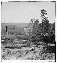 Captain Grant planned a series of 17 redoubts forming a 10-mile (16 km) circle over a mile (1.6 km) out from the center of town. These would be interlinked with a series of earthworks and trenches, along with rows of abatis and other impediments to enemy troops. Construction on the extensive defensive works began in August 1863. They were bounded on the north by high ground (the present location of the Fox Theatre), the west by Ashby Street, the south by McDonough Drive and the east by what is today known as Grant Park. Gilmer inspected the completed work in December 1863 and gave his approval.[11] Because of how the subsequent campaign unfolded, most of these fortifications were never really put to the test.[23][24]
