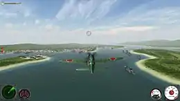 The player assumes control of several historic aircraft, including the Douglas SBD Dauntless, Aichi D3A, Vought F4U Corsair, and Mitsubishi A6M Zero.[1] If the player fails a mission, planes are deducted from their reserve, and the campaign ends in defeat once all planes are deducted. Aircraft carry unlimited ammunition, limited only by overheating for machine guns and reloading times for rockets, bombs, and torpedoes.[4] The player can view different perspectives of the plane, such as a wing view and a chase view.[5]