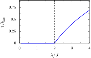 For irrational values of , corresponding to a modulation of the onsite energy incommensurate with the underlying lattice, the model exhibits a quantum phase transition between a metallic phase and an insulating phase as is varied. For example, for (the golden ratio) and almost any ,[3] if the eigenmodes are exponentially localized, while if the eigenmodes are extended plane waves. The Aubry-André metal-insulator transition happens at the critical value of which separates these two behaviors, .[4]