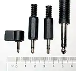 A phone connector (tip, ring, sleeve) also called an audio jack, phone plug, jack plug, stereo plug, mini-jack, or mini-stereo. This includes the original 6.35 mm (quarter inch) jack and the more recent 3.5 mm (miniature or 1/8 inch) and 2.5 mm (subminiature) jacks, both mono and stereo versions. There also exists 4.4 mm Pentaconn connectors.