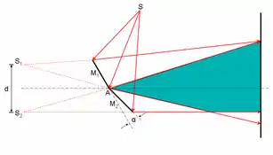 In the same supplement, Fresnel described his well-known double mirror, comprising two flat mirrors joined at an angle of slightly less than 180°, with which he produced a two-slit interference pattern from two virtual images of the same slit. A conventional double-slit experiment required a preliminary single slit to ensure that the light falling on the double slit was coherent (synchronized). In Fresnel's version, the preliminary single slit was retained, and the double slit was replaced by the double mirror—which bore no physical resemblance to the double slit and yet performed the same function. This result (which had been announced by Arago in the March issue of the Annales) made it hard to believe that the two-slit pattern had anything to do with corpuscles being deflected as they passed near the edges of the slits.[123]