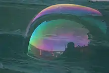 Altered colors of skylight reflected in a soap bubble, due to thin-film interference (formerly called "thin-plate" interference)