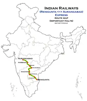 The 17621 / 22 Aurangabad Renigunta Junction Express runs from Aurangabad via Jalna, Parbhani Junction, Parli Vaijnath, Latur Road junction, Vikarabad, Raichur, Guntakal Junction, Yerraguntla Junction, Cuddapah to Renigunta Junction.