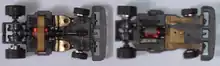 | 1976 | G-Plus | Innovative in-line motor design that increased speed as well as magnetic exposure to the track rails. This chassis allowed for detailed open wheel Formula 1 style car bodies in its narrow version. | |