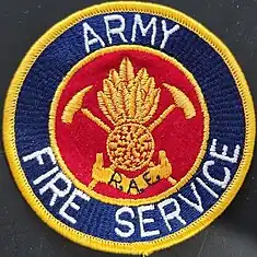 In more modern times the first known example of a colour patch worn by Australian Army personnel was that of the Australian Army Fire Service (AFS). The patch was originally designed and worn by members of the Enoggera Fire Station (c.1980) and consisted of a blue roundel ring around a red circle in the centre. The words "Army Fire Service" emblazoned in the blue roundel and an image of the Royal Australian Engineer 'bomb' insignia in front of two crossed fire axes in centre circle. The badge was worn on the right sleeve, and whilst initially unofficial, it was quickly adopted by all other units of the Australian Army Fire Service, including being used as insignia on the doors of AFS vehicles. Over time the patch was modified several times, with the image below depicting the second generation, where the blue outer edge stitching was changed to gold.