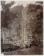 A mining village grew in the valley. Access to the valley floor was by an incline railway. In 1880, a 14 km long narrow-gauge railway was opened to connect the incline with the Main South railway at Mittagong.[14][15] The rails used on the railway were notable as being rolled at the Fitzroy Iron Works, using wrought iron manufactured there from local raw materials.[16][17] The railway closed in 1904,[14] but was still intact in 1911.[18]