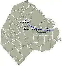 It extends 69 blocks from Eduardo Madero Avenue in the eastern Puerto Madero neighborhood to the West and later to the Northwest and ends at Federico Lacroze Avenue in the Chacarita neighborhood. Automobile traffic runs from west to east. Line B of the Buenos Aires Metro runs most of its length underneath the street.