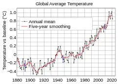 In 2005, an international conference titled Avoiding Dangerous Climate Change: A Scientific Symposium on Stabilisation of Greenhouse Gases examined the link between atmospheric greenhouse gas concentration and global warming and its effects. The conference name was derived from Article 2 of the charter for the United Nations Framework Convention on Climate Change[1] The conference explored the possible impacts at different levels of greenhouse gas emissions and how the climate might be stabilized at a desired level. The conference took place under the United Kingdom's presidency of the G8, with the participation of around 200 "internationally renowned" scientists from 30 countries. It was chaired by Dennis Tirpak and hosted by the Hadley Centre for Climate Prediction and Research in Exeter, from 1 February to 3 February.[2] The conference was one of many meetings leading up to the 2015 Paris Agreement, at which the international community agreed to limit global warming to no more than 2 °C in order to have a 50-50 chance of avoiding dangerous climate change. However, a 2018 published study points at a threshold at which temperatures could rise to 4 or 5 degrees through self-reinforcing feedbacks in the climate system, suggesting the threshold (or 'tipping point') is below the 2 degree temperature target.[3]
