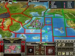 At the start, the player chooses a nation and a general to play as, then the game displays a game board showing a panoramic map of the world with territory tiles.[2] A number of territories, such as Australia or Germany, have defensive pieces already in place. The player and computer players take turns purchasing infantry, mechanized, armor, and air support pieces from their home country and move them across the map to engage enemy armies and territories.[1] Each nation has reduced recruitment cost for a specific military piece; for example, Germany recruits cheaper armor pieces, Russia has cheaper infantry pieces, and Japan has cheaper air support pieces. Moreover, each nation can purchase technologies to increase the chance that its battles will be successful; these are the same researches encountered in RTS mode. Either the Allies or Axis wins when two capitals of the opposing side are conquered.[8][17]