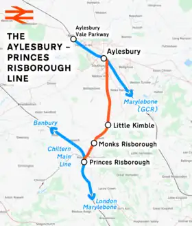 The Aylesbury–Princes Risborough line is a rural branch line between Princes Risborough and Aylesbury in Buckinghamshire, England. The line is single track throughout with a maximum speed of 40 mph.[1]