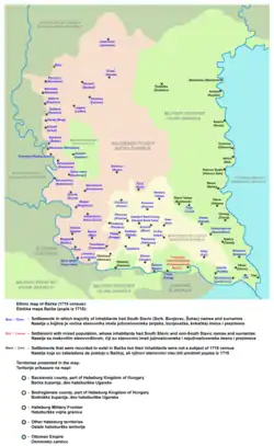 Bács county arose as one of the first counties of the medieval Kingdom of Hungary, in the 11th century. Bodrog county was also formed in the 11th century.[1] The area was taken by the Ottoman Empire in the 16th century [2] and the two counties were abolished. During the Ottoman administration, the area of the former counties was part of the Sanjak of Segedin. The Bács and Bodrog counties were established again after the Bácska region was captured by the Habsburg monarchy in 1699;[3] later, the two counties were joined into a single county in 1802. Some (mostly eastern) parts of Bácska were incorporated into the Theiß-Marosch section of the Military Frontier.[3] After this part of the Military Frontier was abolished in 1751, these parts of the Batschka were also included into Bács-Bodrog county. The only part of the Batschka region which remained within the Military Frontier was Šajkaška, but it too came under civil administration in 1873.