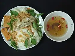 Bánh ướt (Vietnamese: [ɓǎjŋ̟ ʔɨ̌ət], lit. 'wet cake'), is a Vietnamese thin pancake wrapper[5] consisting of rice noodle sheets, eaten with nước chấm, fried shallots, and a side of chả lụa (Vietnamese pork sausage).