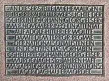 Near the entrance to the GEMA building, a plaque in the pavement marks the position of the pillar that concealed Georg Elser's bomb in his attempt to assassinate Adolf Hitler.[11]