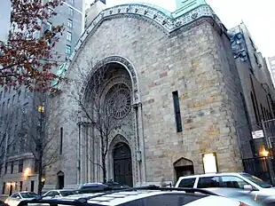 In 1864, the congregation moved yet again, to a new building on 34th Street,[2] the parcel later became part of the site of the flagship Macy's store. Driven by the rapid expansion of the city, they moved yet again in the spring of 1885 to Madison Avenue at 65th Street. That building was designed by Rafael Guastavino and Schwarzmann & Buchman.[16] Less than a year later, a fire did extensive damage to the building.[17] Reports rated the damage at $35,000.[18][19] B'nai Jeshurun was temporarily relocated to Congregation Ahawath Chesed, now Central Synagogue, on Lexington Avenue, which ironically had a fire of its own within the month, leaving both congregations homeless.[20]