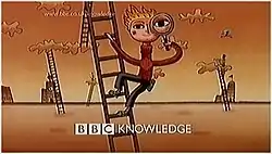 BBC Knowledge was launched on 1 June 1999 with the intent of creating a multimedia learning channel.[1] The idea was that computers, interactive TV via the Red Button and television could come together to make a new, factual, learning channel for children and adults alike.[1] The launch identity consisted of cartoon characters climbing 'ladders of learning' between clouds against an orange background.[1][2] All the idents featured the station logo, which followed the BBC style design of the time by having the station name follow the BBC logo in upper case. This white logo would appear at the end of ident.[1][2]