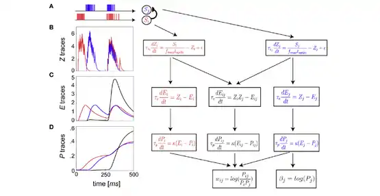 The BCPNN learning rule was derived from Bayes rule and is Hebbian such that neural units with activity correlated over time get excitatory connections between them whereas anti-correlation generates inhibition and lack of correlation gives zero connections. The independence assumptions are the same as in naïve Bayes formalism. BCPNN represents a straight-forward way of deriving a neural network from Bayes rule.[2][3][17] In order to allow the use the standard equation for propagating activity between neurons, transformation to log space was necessary. The basic equations for postsynaptic unit intrinsic excitability and synaptic weight between pre- and postsynaptic units, , are: