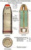 - ↑ Shell weights given are filled and fuzed i.e. as fired. 100 lb (45 kg) was standard shell weight in WWI. Some earlier shells had slightly higher weights e.g. Mk IV common lyddite shell weighed 101 pounds (46 kg).