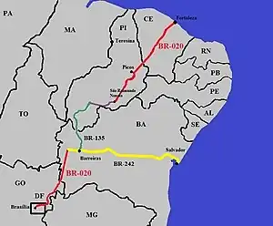 The BR-242 is a Brazilian federal highway that connects the cities of Maragogipe, in the state of Bahia, to Sorriso, Mato Grosso. It has a total length of 2,295.5 km.[1]