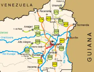 BR-401 is a federal highway in the state of Roraima in Brazil. The 202.9 km (126.1 mi) road[1] connects Boa Vista with Normandia and the road network of Guyana.[2][3]