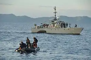 The BRP Hilario Ruiz (PC-378) is the eighth ship of the Jose Andrada class coastal patrol boats of the Philippine Navy. It is part of the first batch of its class ordered through US Foreign Military Sales (FMS) in 1990, and was commissioned with the Philippine Navy on 1 June 1995.[3][4] It was initially designated as Fast Patrol Craft, and was numbered "DF-378", but later on was re-designated as Patrol Gunboat "PG-378".[3] Another round of reclassification was made in April 2016, which redesignated the patrol gunboat as the coastal patrol craft BRP Hilario Ruiz (PC-377).