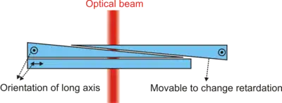 The Babinet–Soleil compensator is a continuously variable, zero-order retarder. It consists of two birefringent wedges, one of which is movable, and another is fixed to a compensator plate. The orientation of the long axis of the wedges is perpendicular to the long axis of the compensator plate.