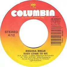 "Baby Come to Me" is a 1989 R&B/Soul single by American singer–songwriter Regina Belle. Released on October 2, 1989 on Columbia Records, The song was written by Narada Michael Walden and Jeffrey Cohen and produced by Narada Michael Walden. This song is from Belle's sophomore album Stay with Me.