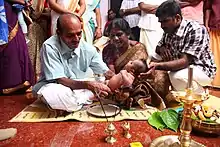 The people involved in the baby naming ceremony are the parents of the newborn, the paternal and maternal grandparents and few close relatives and friends. In Maharashtra, Bengal, and among the Rajputs of Gujarat the paternal aunt has the honour of naming her brother's child.[5] The child is dressed in new clothes and the mother wets the head of the baby with drops of water as a symbol of purifying the child. In some communities, the baby is then handed over to the paternal grandmother or the father who sits near the priest during the ritual. Where the paternal aunt names the child, she whispers the newborn his or her name in the ear and then announces it to the gathered family and friends. In some communities or families, the sacred fire is lighted and the priest chants sacred hymns to invoke the deities in heaven to bless the child.